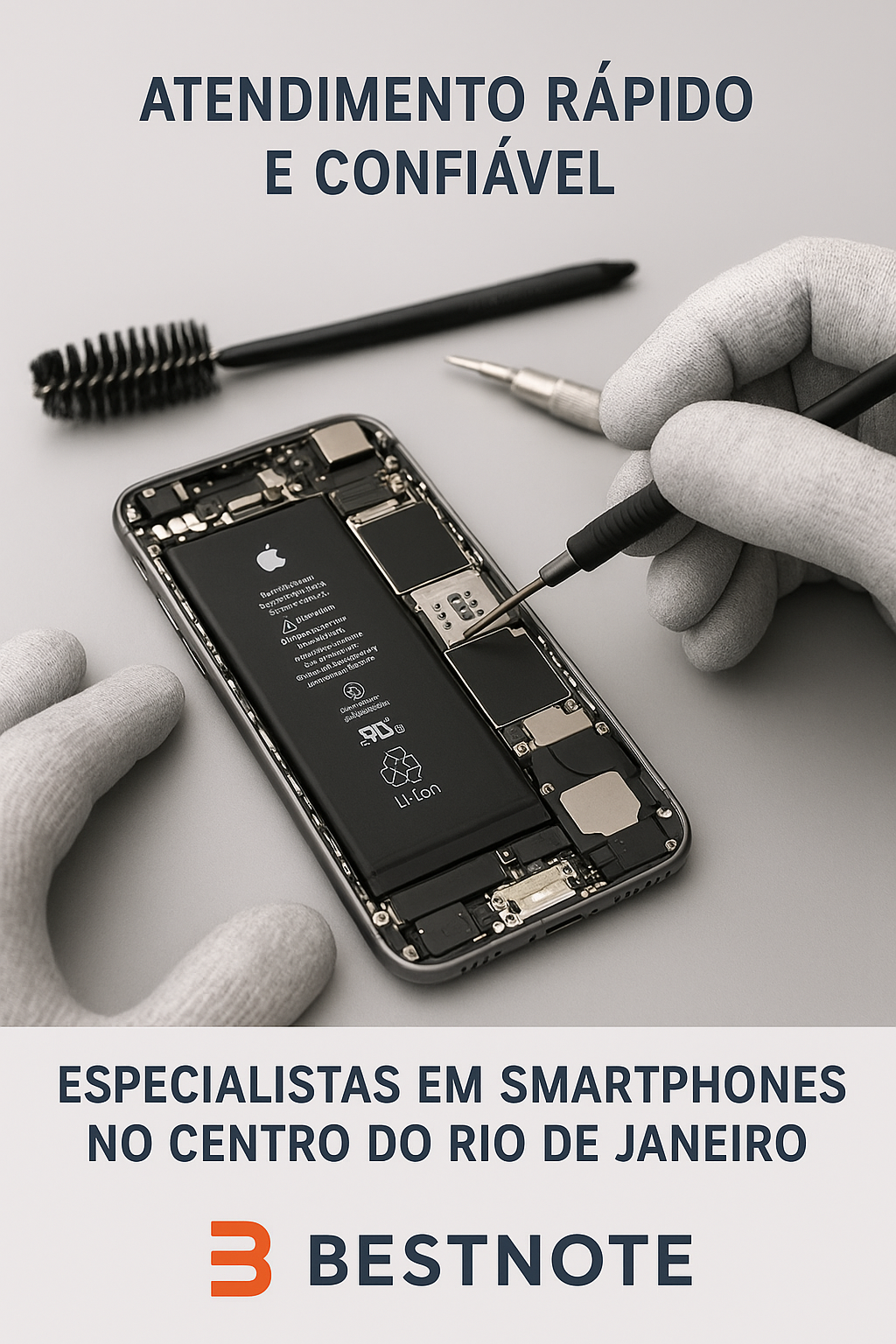 Assistência técnica em smartphones no Rio de Janeiro com atendimento rápido, seguro e confiável. A Bestnote RJ é especialista em Apple, Samsung, Xiaomi, Motorola e Huawei, oferecendo reparos com peças originais e garantia completa. Atendemos clientes em toda a cidade, incluindo Centro, Zona Norte e Zona Sul do RJ. Seu celular volta a funcionar como novo, sem complicação. Não perca mais tempo – agende seu reparo agora mesmo!